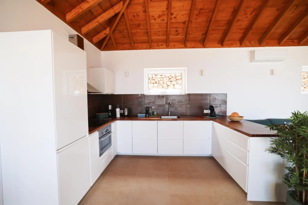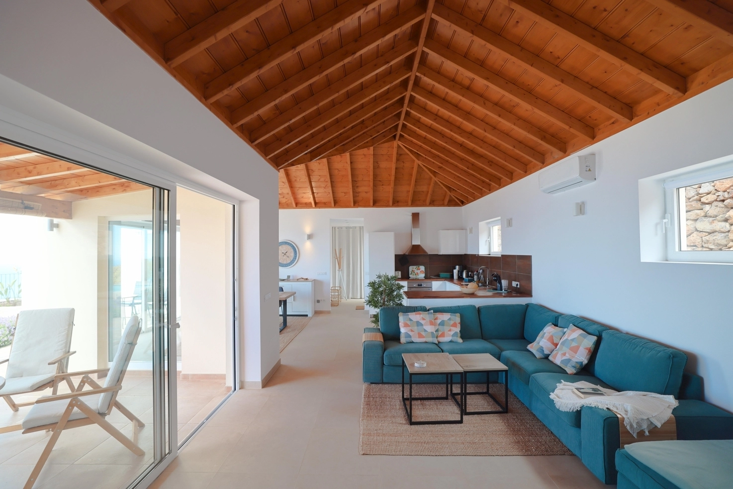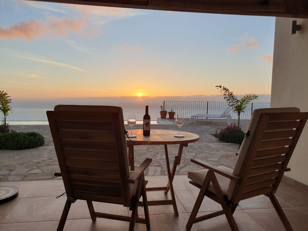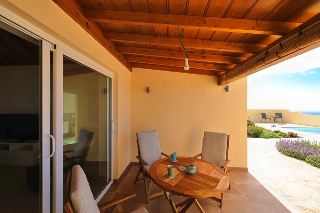 Direkt vom Wohnzimmer aus gehen Sie durch die Schiebetüren auf die überdachte Terrasse (3 x 4 m), die Ihnen nicht nur von beiden Seiten Schutz vor Wind und Regen bietet, sondern auch an sehr sonnigen Tagen Schatten spendet. Von dort aus schauen Sie auf den Infinity Pool und das Meer. Hier können Sie abends bei einem Glas Wein den Sonnenuntergang im Meer genießen.